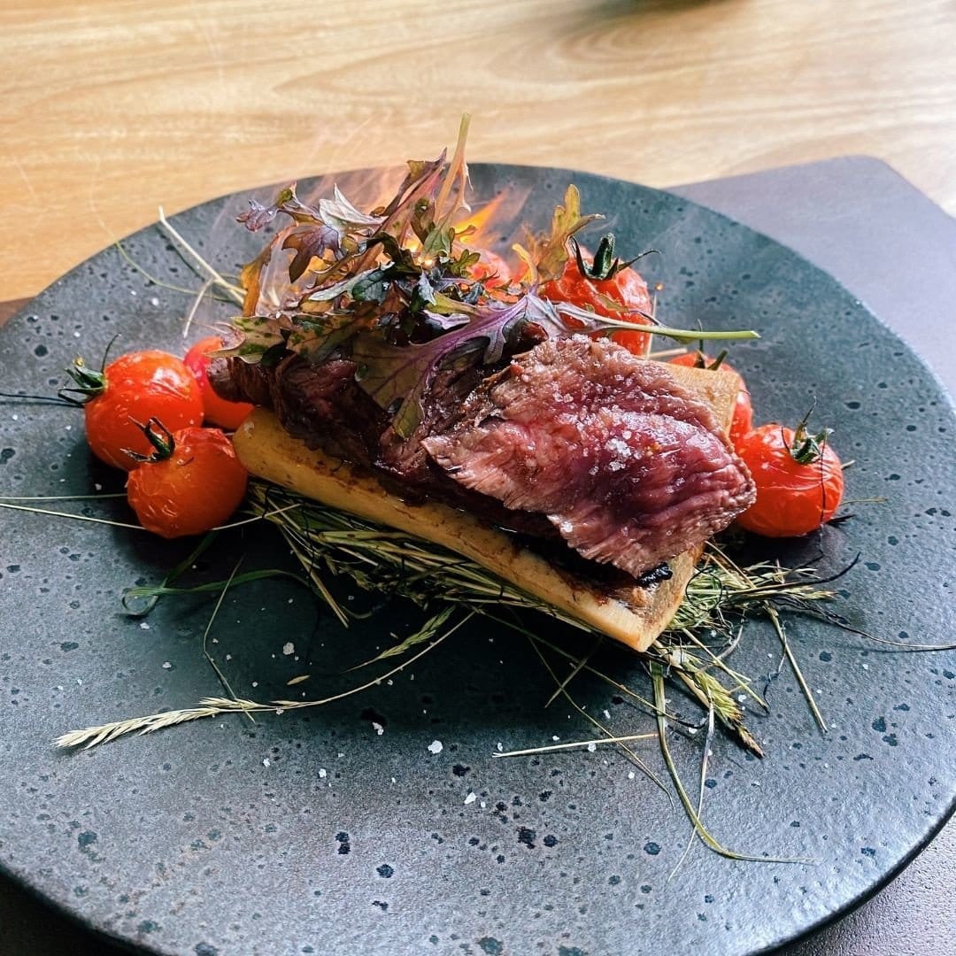 Rubia Gallega Presa steak met mergpijp op hooi gegaard en geroosterde tomaten