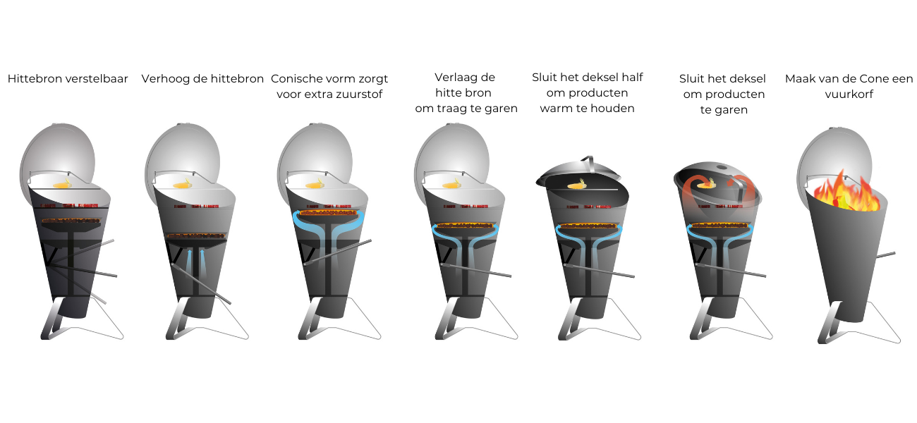 Cone is 's werelds eerste houtskoolgrill waar u de warmtebron direct kunt aanpassen. Het vertaalt zich in het comfort van een gasbarbecue en toch kook je op een houtskoolbarbecue met echte vonken, echt vuur en een echte sfeer. Een handige rvs stangetje zorgt ervoor dat het deksel blijft aan de BBQ hangen, dus nooit meer zoeken waar naartoe met die deksel.